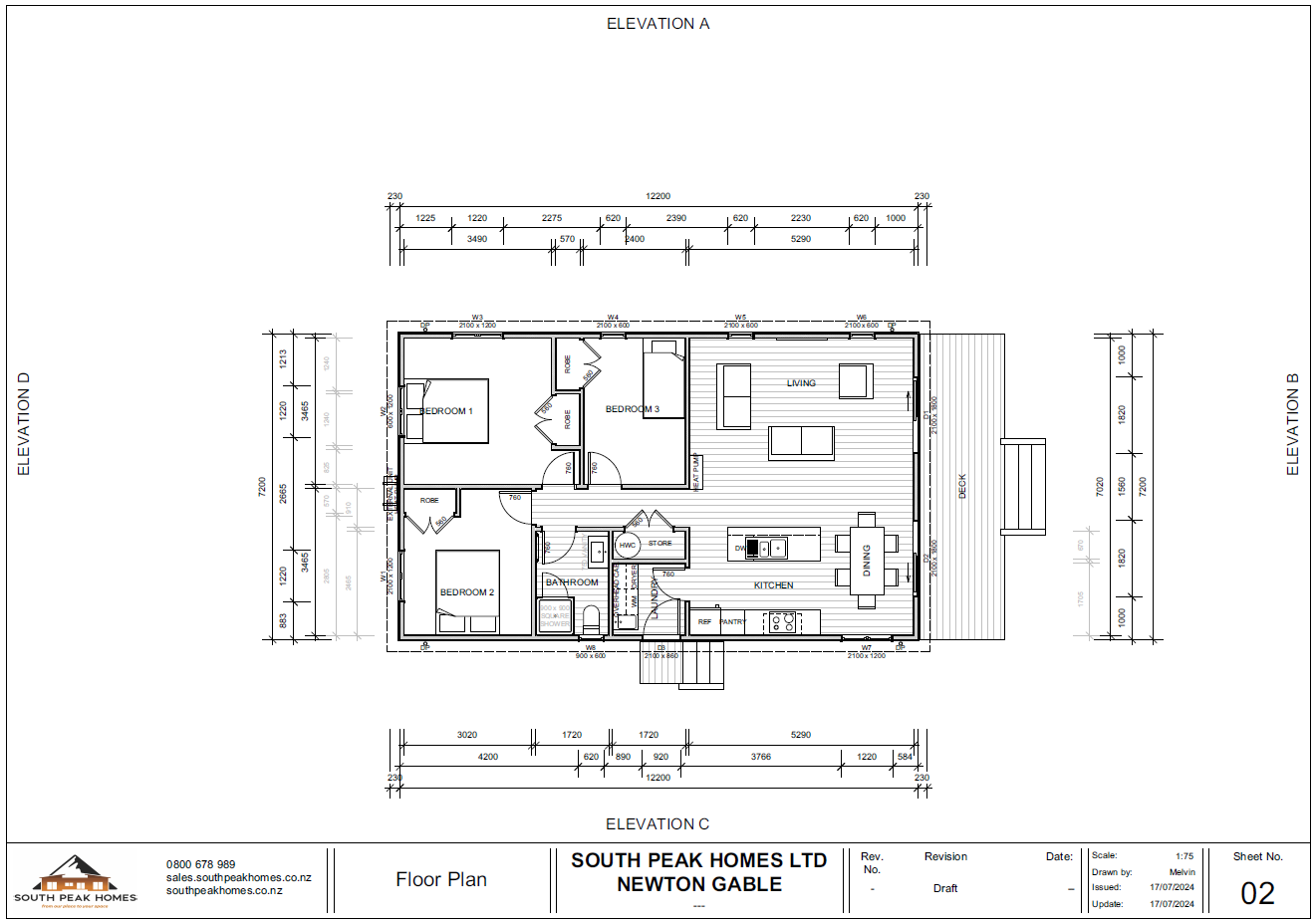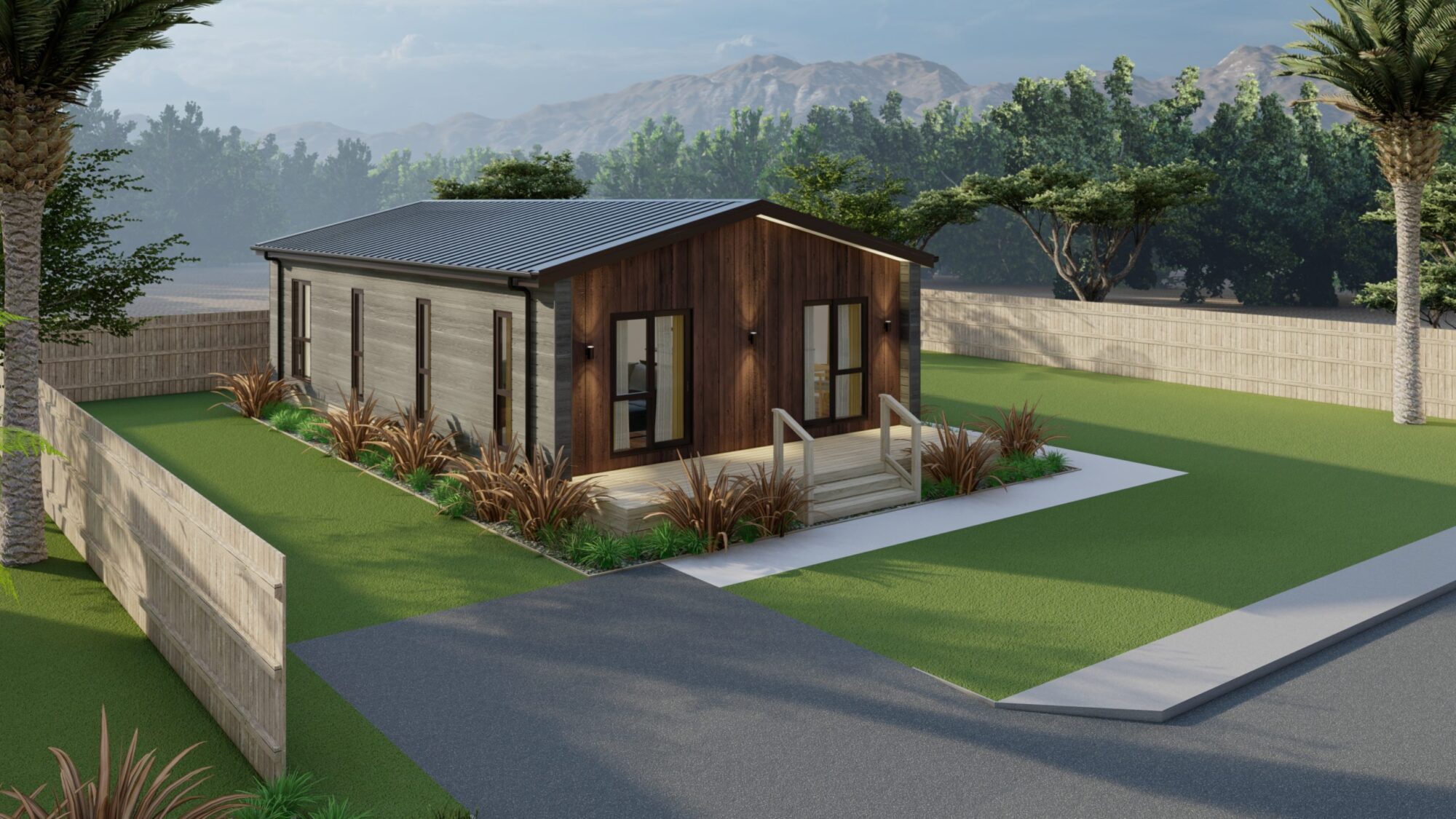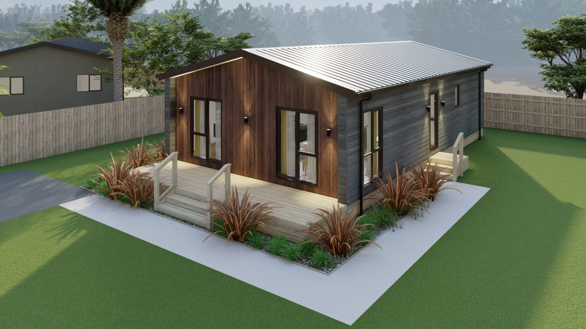 This is based on our Newton house plan with standard specifications, using 4.5m driven timber piles and a 675mm finished floor level. Pricing includes the house on piles, land, deck, steps, baseboards, service connections & code of compliance. Price includes GST. The house will be constructed off-site in our Westport factory & delivered to this site. Image shown is an artist’s impression only & the landscaping is not included. Other conditions may apply.