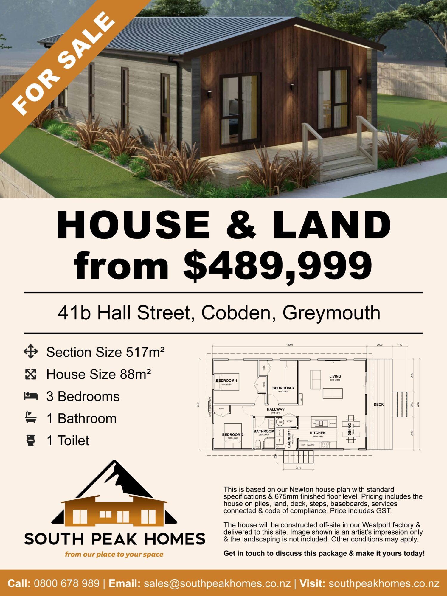 Here’s a great option for a small family, retirees, staff or guest accommodation close to town & the beach! This is amazing value for a brand new 3 bedroom prefabricated home placed on this section that has plenty of benefits including a flat site for ease of construction & access, close to Greymouth town, the river & the beach. Its has a 6ft wooden fence around three sides, concrete driveway from the roadside, water, power, stormwater & fibre available at the boundary.