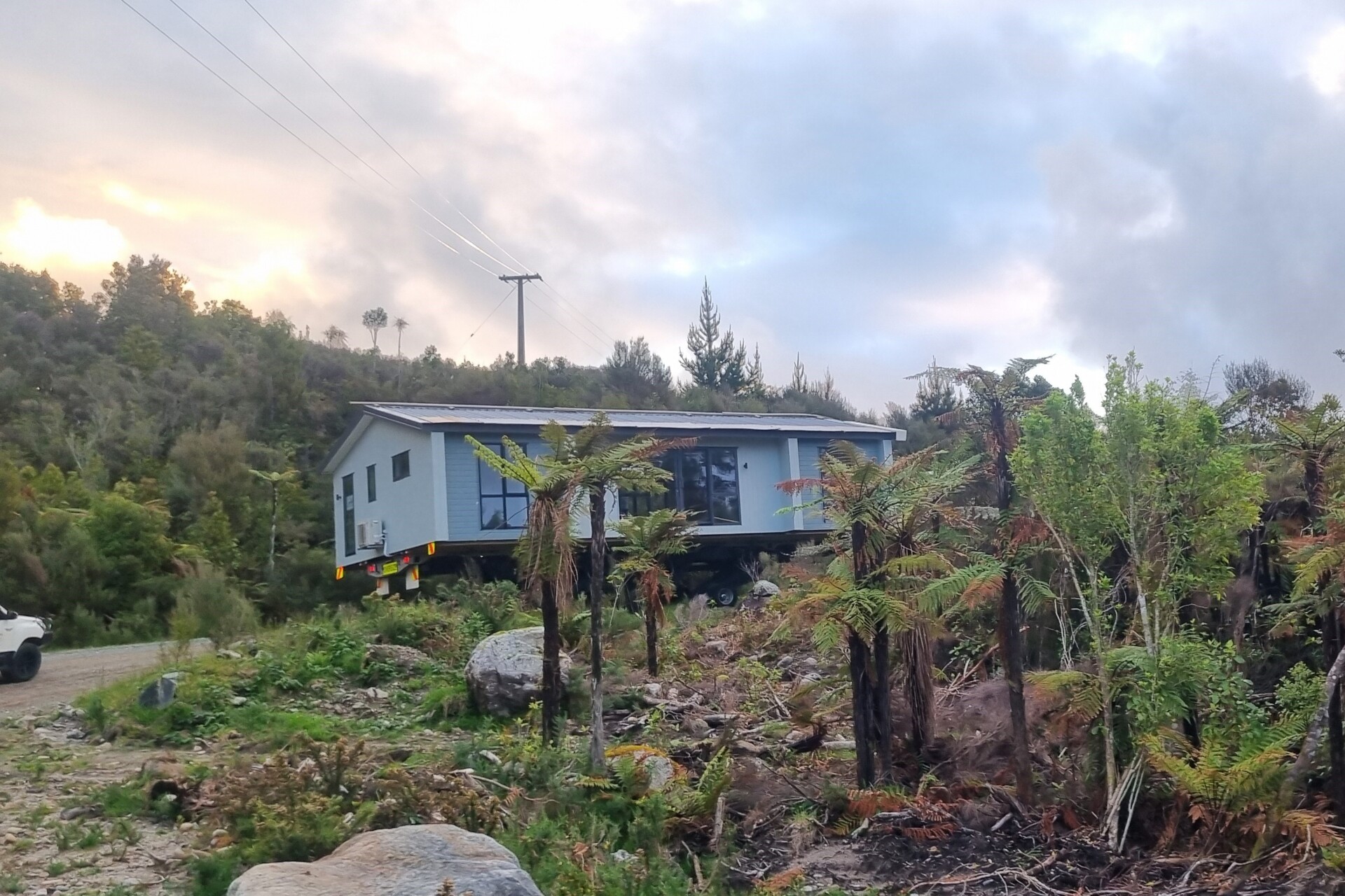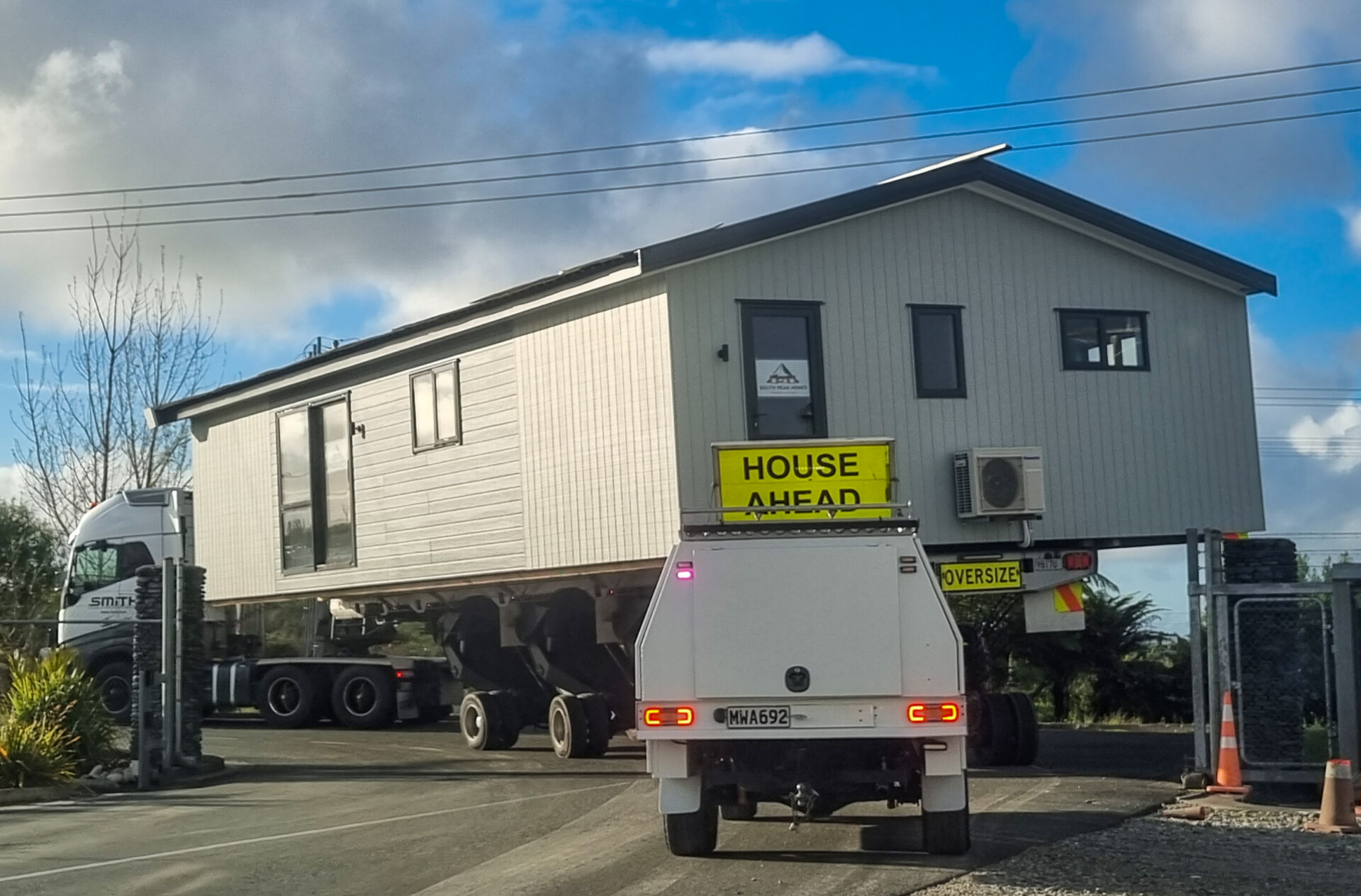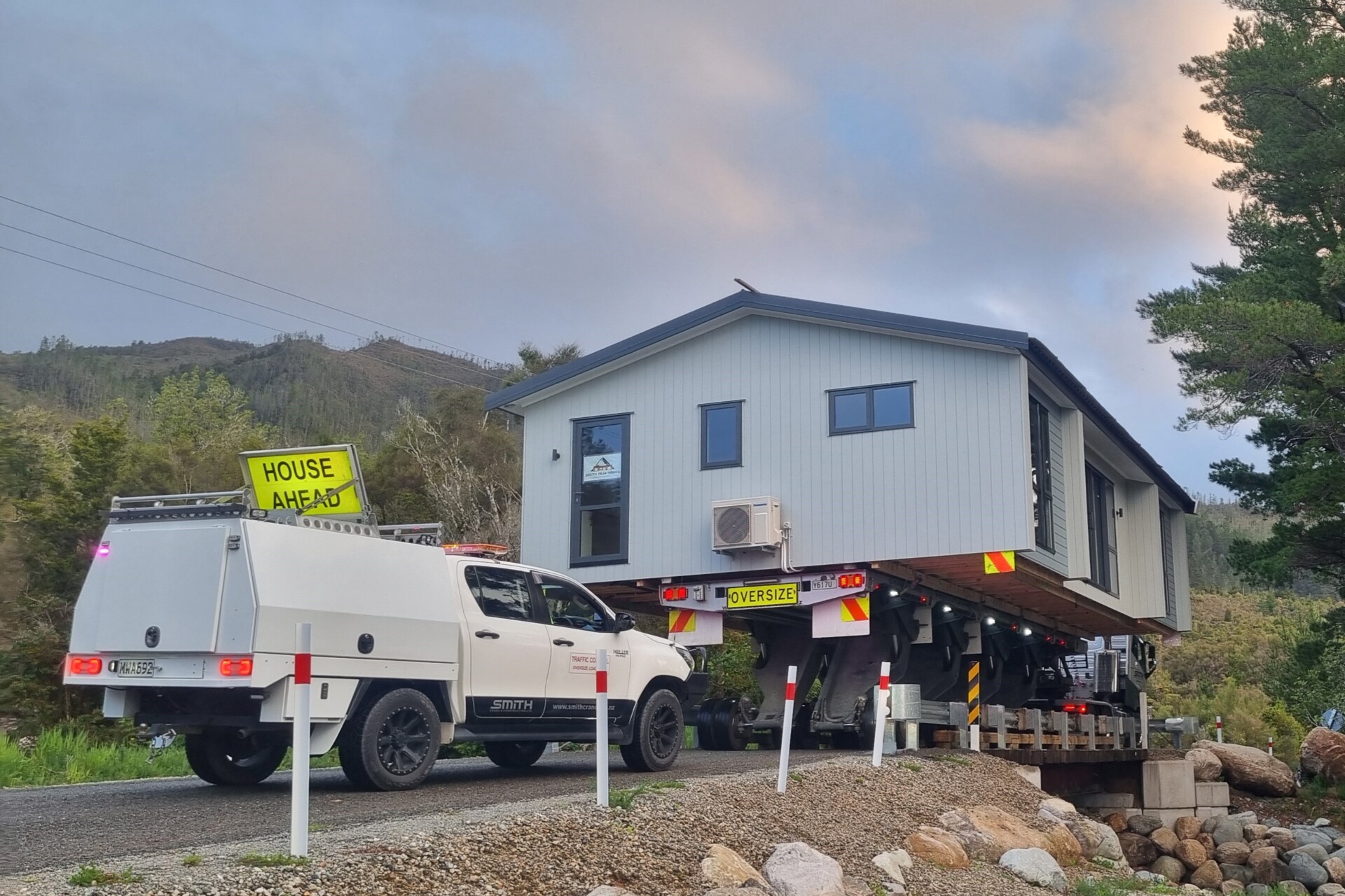 Yesterday evening, another one of our homes moved to a serene rural setting in Westport. This is a modern 2 bedroom home that has great architectural style with its mix of cladding, colours & wing walls. Its our popular Travers design featuring two large bedrooms, a walk-in robe, ensuite, open plan living and a beautiful kitchen with a black benchtop and oak island.