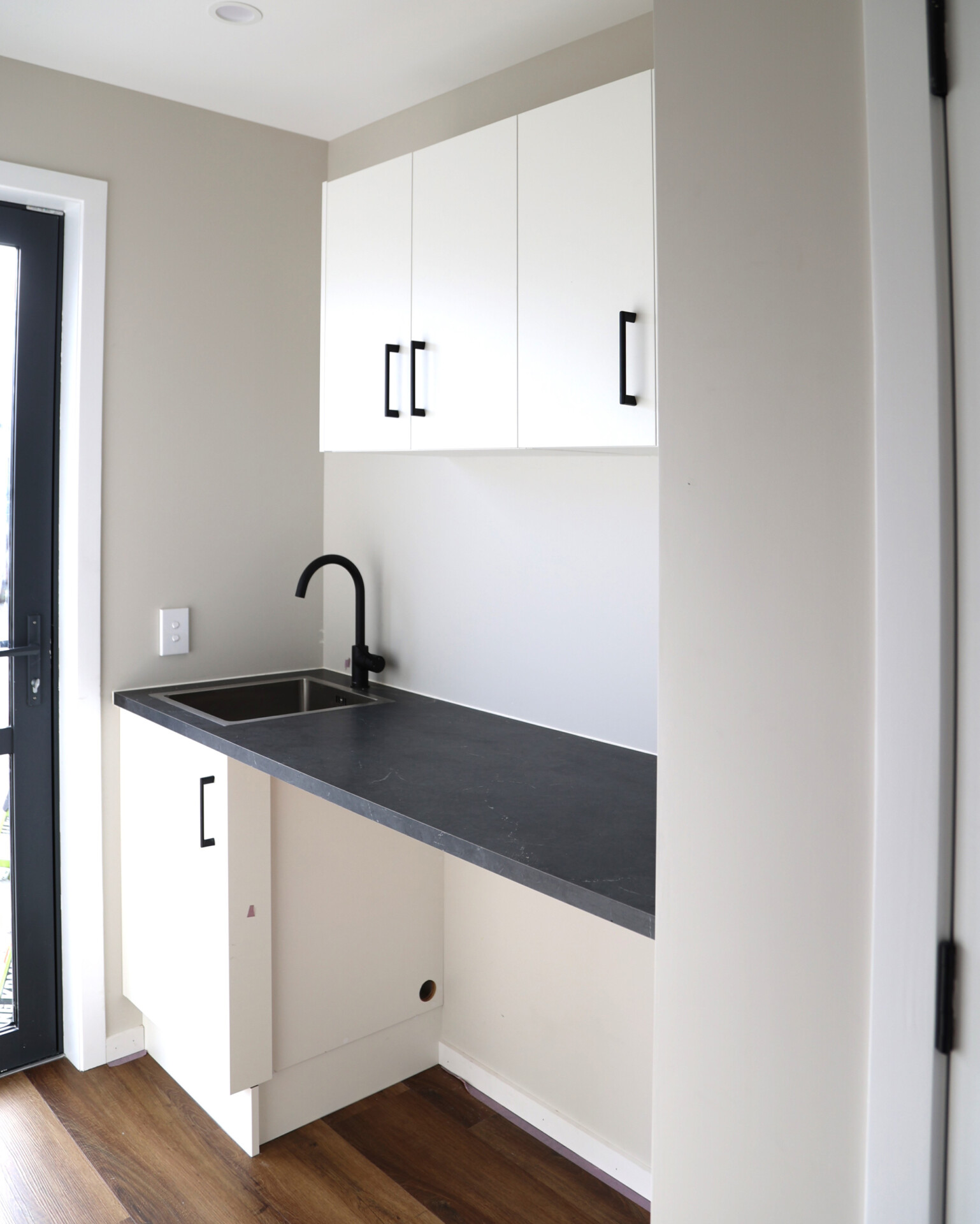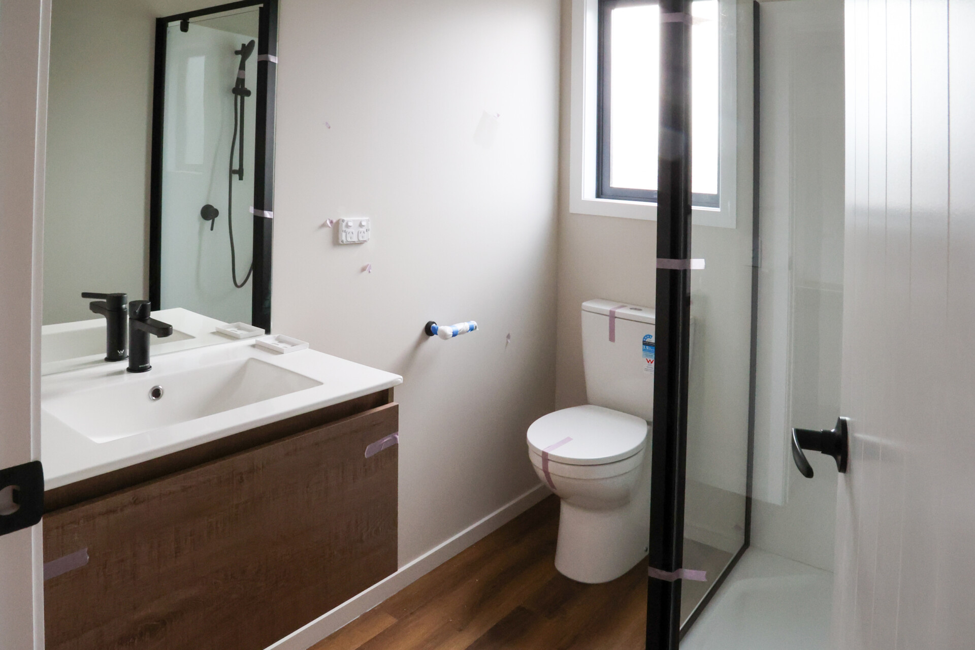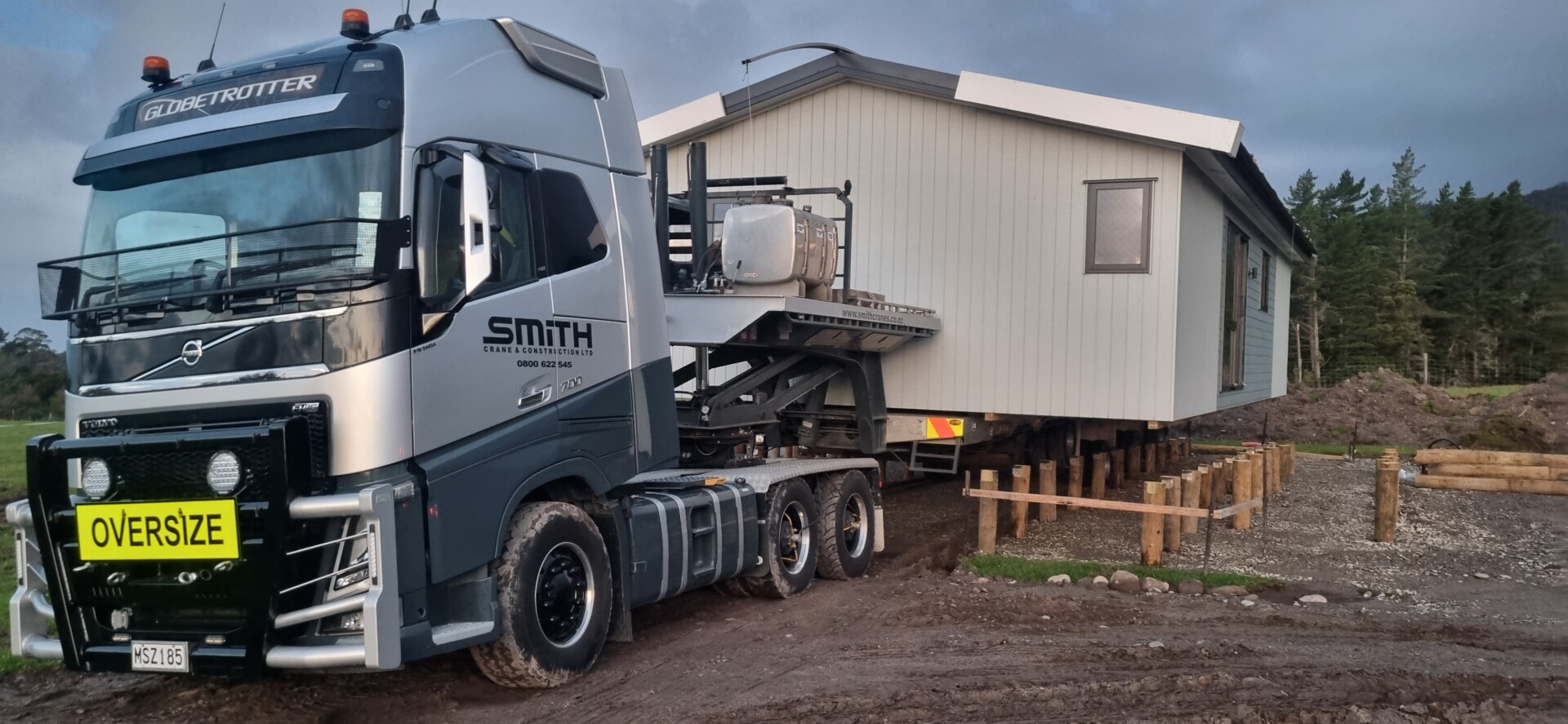 Yesterday evening, another one of our homes moved to a serene rural setting in Westport. This is a modern 2 bedroom home that has great architectural style with its mix of cladding, colours & wing walls. Its our popular Travers design featuring two large bedrooms, a walk-in robe, ensuite, open plan living and a beautiful kitchen with a black benchtop and oak island.