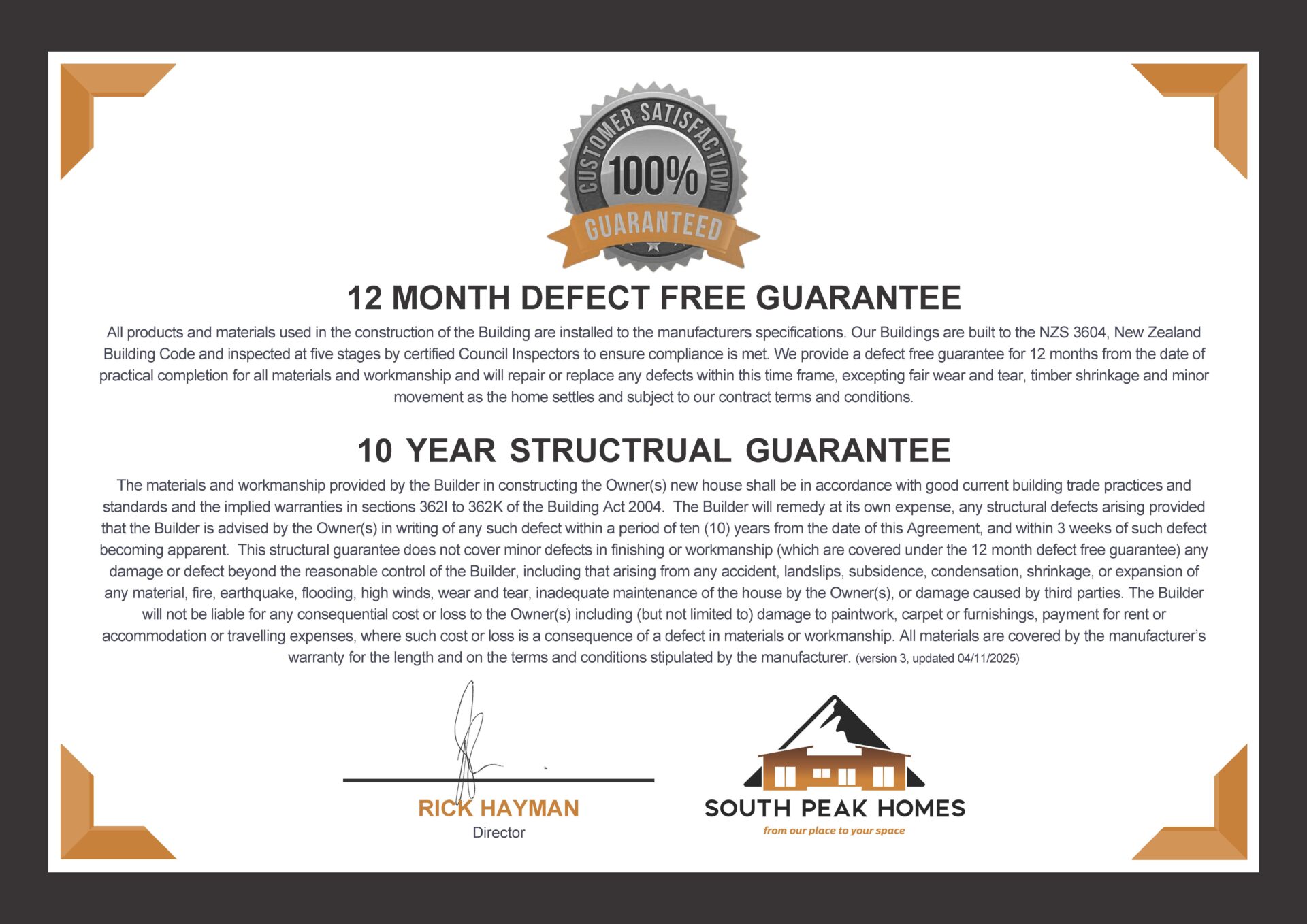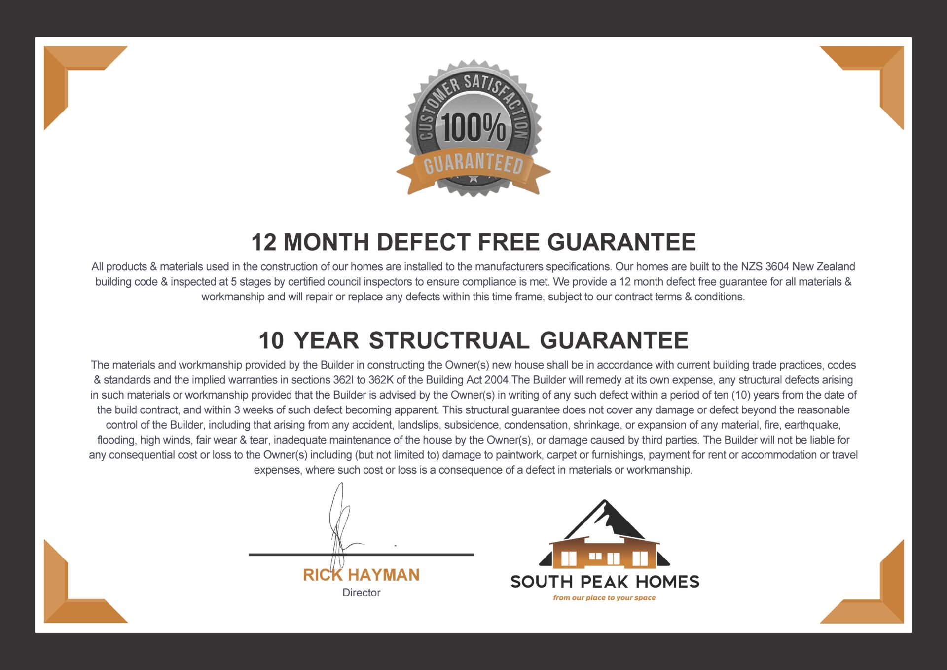 We provide a 12 month defect free guarantee and a 10 year structural guarantee and will repair or replace any defects within this time frame, subject to the terms & conditions in this certificate and our construction contract.