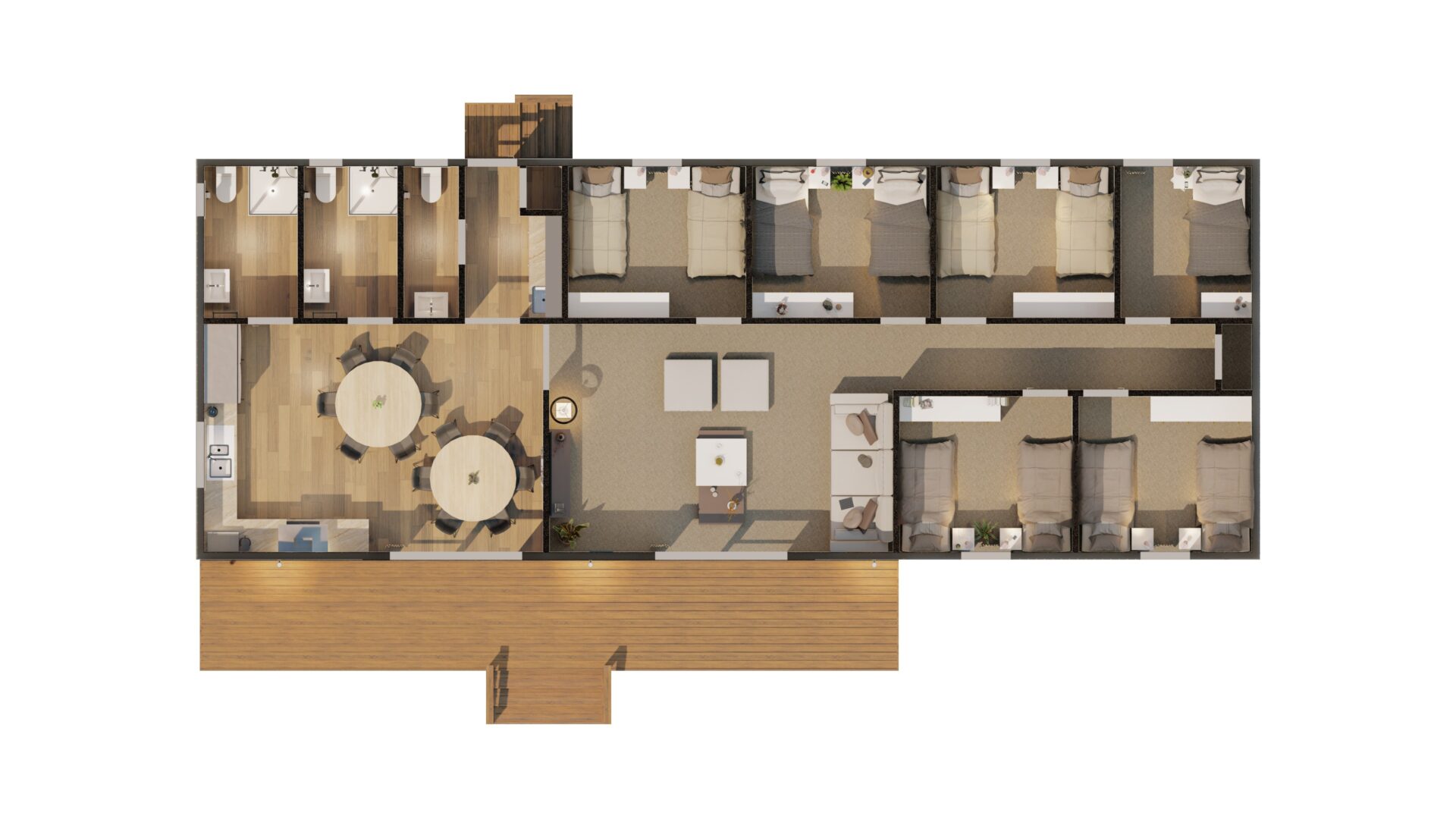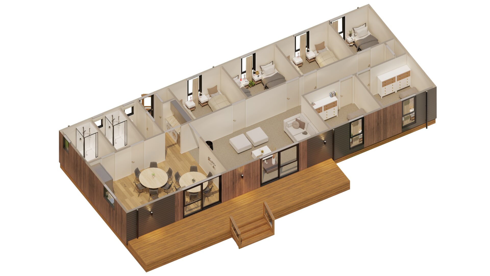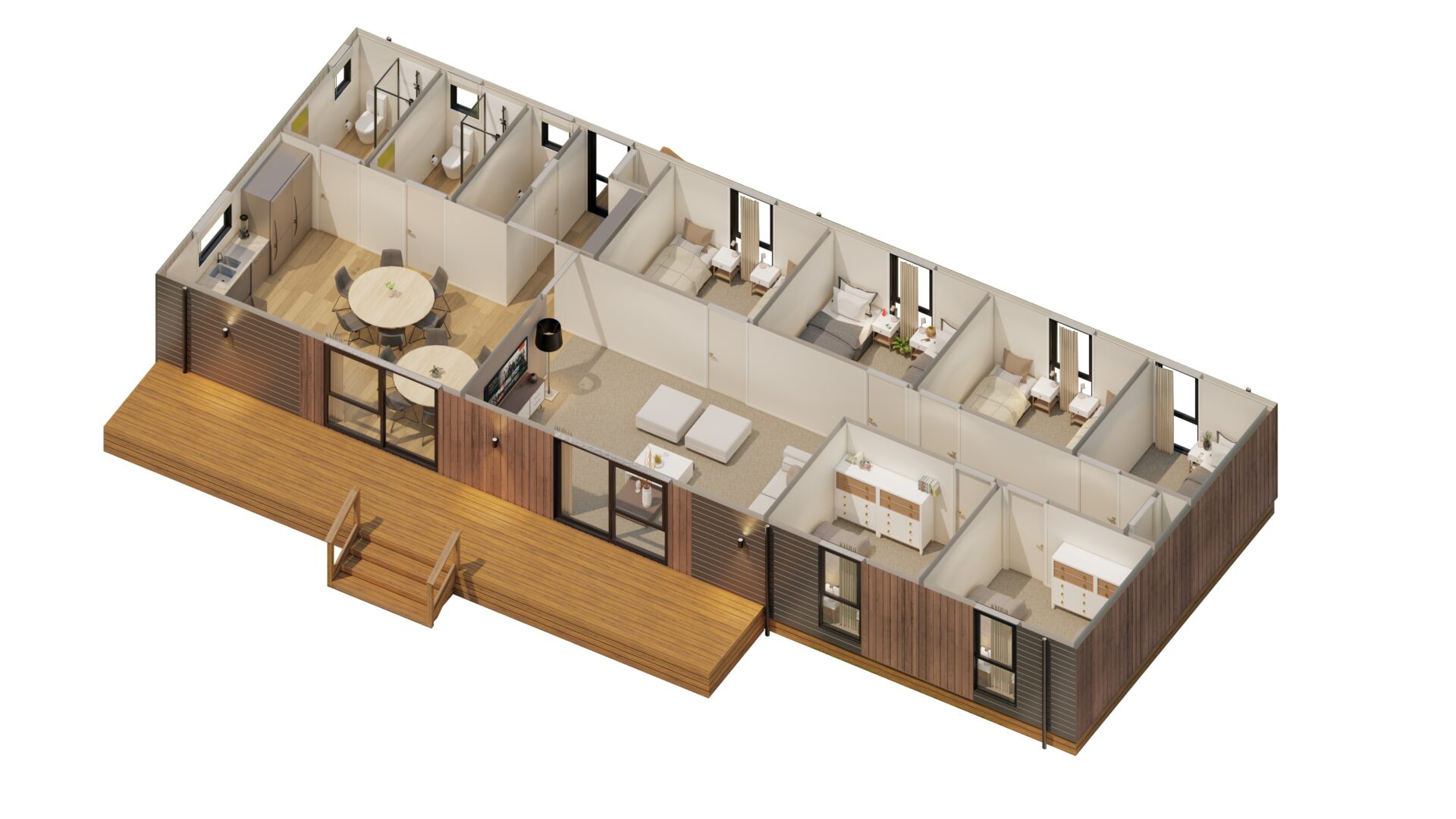 This is a great option for a self contained, all in one accommodation unit for up to 11 people and features 2 bunk rooms, a full bathroom, a large open plan kitchen, lounge, dining area and a laundry. At 7.2m wide x 17.1m long this unit will accommodate a large number of staff members or guests very comfortably, with plenty of living and socializing space. Verandahs, decking and siteworks can be arranged as required.